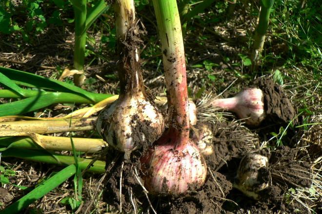 - Lors de la récolte de l'ail d'hiver, la maturité est déterminée en fonction des flèches, en faisant attention aux bulbes à air qui se forment à leurs extrémités. Dans le cas où il y a déjà des fissures sur la coque et que le bulbe lui-même est clairement visible, il est nécessaire de commencer à creuser la récolte.