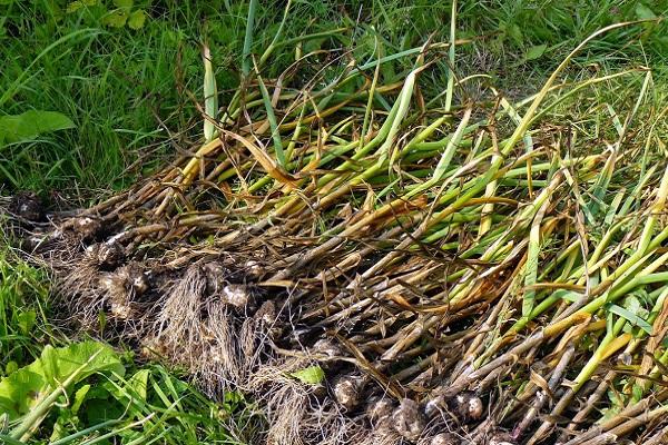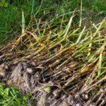 - Creusez doucement l'ail et sortez-le avec les tiges et les feuilles. Cela est nécessaire pour que les tiges libèrent les nutriments qu'elles contiennent vers les têtes.