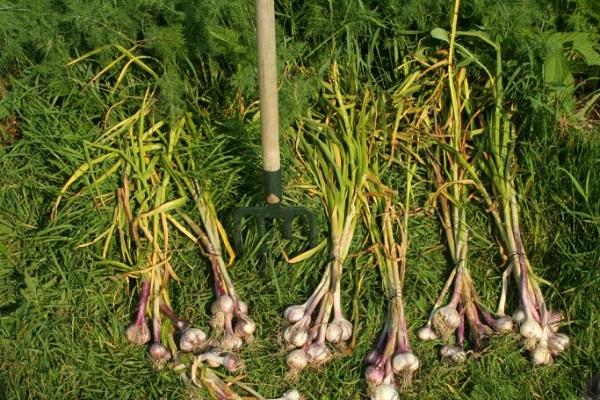 Il est recommandé de déterrer les têtes d'ail par temps sec et ensoleillé, si la récolte est effectuée pendant la pluie, ces spécimens seront mal stockés et commenceront à pourrir avant le nouvel an. Le processus de récolte est effectué selon l'algorithme suivant: