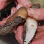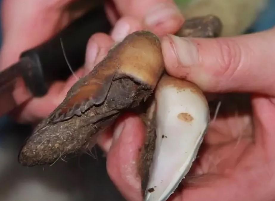 Das Nivellieren wird durchgeführt, wobei häufig die leicht überwachsene Schicht abgeschnitten wird (alle 2-3 Wochen). Nach 3-5 Beschneidungen erscheint die Ebene des Hufes, die Blutgefäße gehen tiefer, das Tier beginnt normal zu laufen. Achten Sie beim Trimmen von Hufen auf den Geruch. Wenn es unangenehm und faul ist, sollten Sie den Schaden suchen und behandeln.