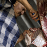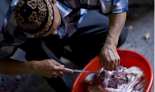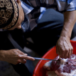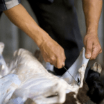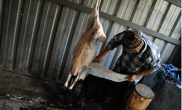 Dann wird mit einem geschärften Messer ein scharfer und tiefer Einschnitt gemacht, so dass der Hals von Ohr zu Ohr präpariert wird. Dann müssen Sie den Kadaver aufhängen, damit das Blut herausfließen kann. Blutungen sind notwendig, da diese Methode das Verderben von Fleisch vermeidet und dessen Qualität verbessert. Der Widder wird 10 Minuten lang in einem hängenden Zustand belassen.