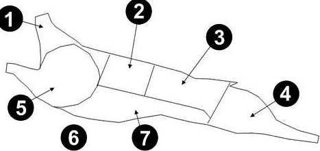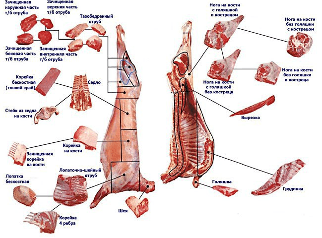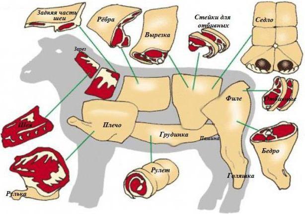 Damit das Fleisch nicht nach Fett riecht, können Sie es vollständig trennen und mageres Lammfleisch erhalten. Wenn jemand Fett mag, können Sie eine Schicht hinterlassen. In keinem Fall lohnt es sich, Schafsfett wegzuwerfen, es ist äußerst nützlich. Das Schneiden der Karkasse selbst ist in der Abbildung dargestellt. Sie können auch ein Lamm schlachten.