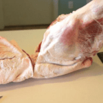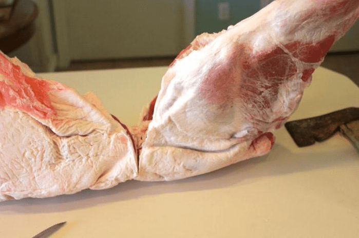 Im nächsten Schritt beginnen sie mit dem Rücken zu arbeiten: Zuerst entfernen sie das fette Schwanzfett. Die Beine sollten an den Gelenken leicht geschaukelt werden, um sie vom Kadaver zu trennen. Die Hinterhand und der Femur werden durch Einwirken entlang des Acetabulums getrennt. Der vordere Teil wird auf die gleiche Weise geschnitten. Wenn die Beine getrennt sind, gehen sie zu den Rippen und schneiden sie von der Wirbelsäule ab.