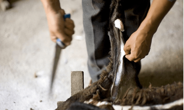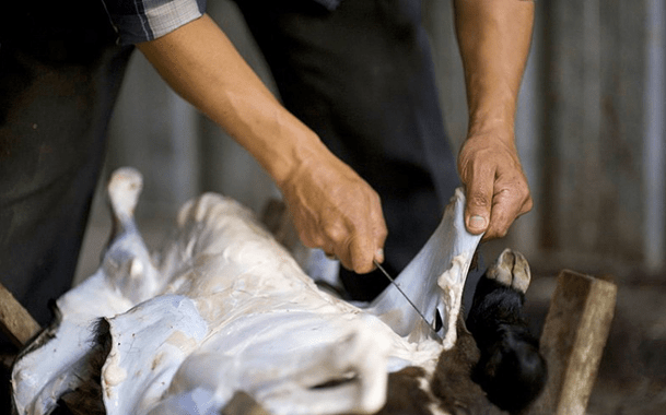 Bereiten Sie den Platz vor, bevor Sie ein Schaf oder einen Widder häuten. Dann wird der Kadaver auf den Rücken gelegt, dann wird ein kleiner Einschnitt (ca. 3 cm) an einem der Beine vorgenommen, um nicht die Muskeln, sondern nur die Haut zu beeinträchtigen. Als nächstes wird ein Dolch, ein schmales Messer oder ein Gummischlauch vorsichtig in den gebildeten Spalt gedrückt. Der Zweck der Operation besteht darin, eine Luftschicht zwischen dem Muskelgewebe und der Außenhülle zu erzeugen. Dann können Sie die resultierende Blase verschieben und so eine vollständige Trennung der Lammhaut erreichen.