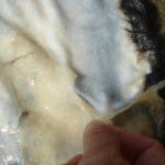 Referenz! Die Haut wird mit der Emulsion behandelt, wobei der Kontakt mit dem Fell vermieden wird.