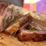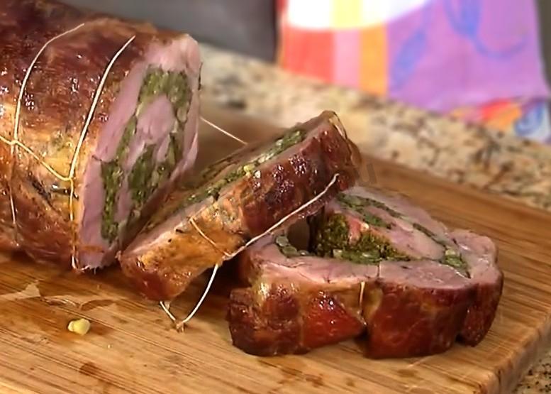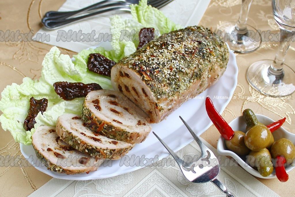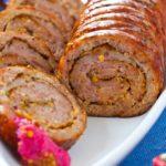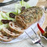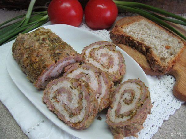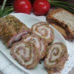 Auch im Rezept verwendet: Petersilie, Zwiebelfedern, Gewürze, Salz. Die Rolle wird im Ofen gebacken, nach der Fertigstellung in Scheiben geschnitten und abgekühlt.