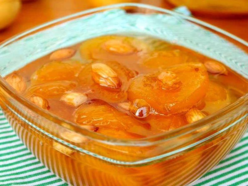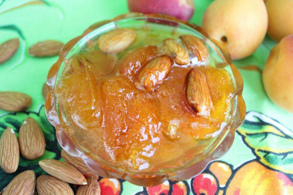 Obst sollte gewaschen, getrocknet und entkernt werden. Zucker und Wasser getrennt mischen und bei schwacher Hitze köcheln lassen. Übertragen Sie die Aprikosen in einen Behälter, fügen Sie die Mandeln und Vanillezucker hinzu. Gießen Sie kochenden Sirup über die Mischung, kühlen Sie ab und bringen Sie sie bei schwacher Hitze zum Kochen. Führen Sie den Vorgang 5-6 Mal durch und gießen Sie ihn dann in Gläser.