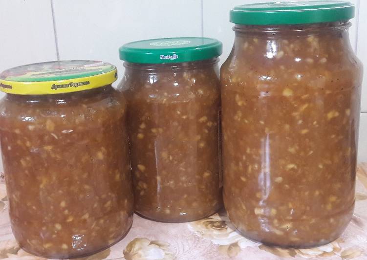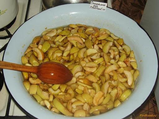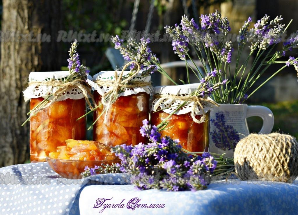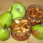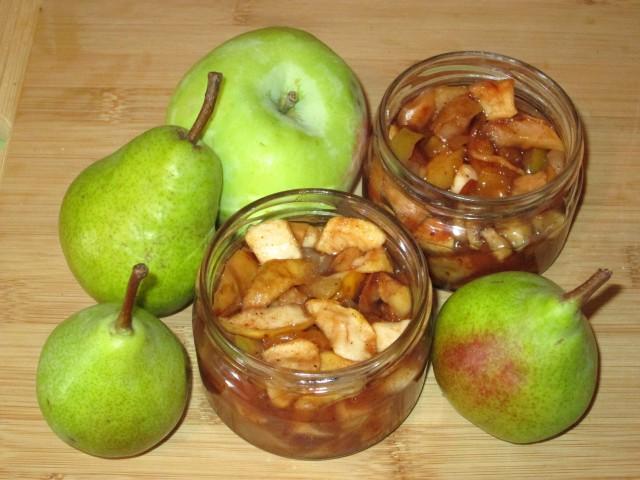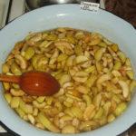Obst muss geschält und gehackt werden. Zuckersirup separat kochen. Mischen Sie die Früchte mit den Gewürzen, fügen Sie Sirup hinzu und kochen Sie sie 10-15 Minuten lang, bis sie weich sind. Gießen Sie heißes Dessert in sterilisierte Gläser und verschließen Sie es.