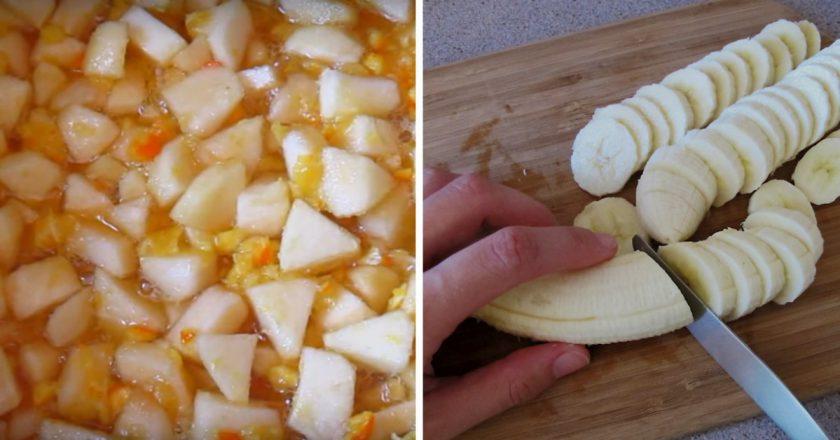 Die Äpfel waschen, schälen und hacken. Bananen pürieren, bis sie püriert sind. Alle Zutaten mischen und 1 Stunde ruhen lassen. Bei schwacher Hitze 1 Stunde unter ständigem Rühren kochen. Vollständig abkühlen lassen, in Gläser füllen und im Kühlschrank aufbewahren.