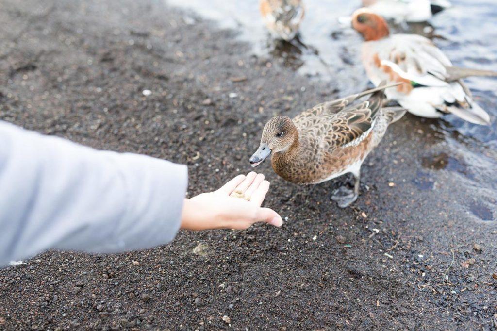 Wenn Sie den Vogel füttern möchten, müssen Sie ein wenig gekochtes Müsli, gekeimtes Getreide, Hüttenkäse, gekochte Eier oder Gemüse mitnehmen. Sie können Scheiben abgestandenes Schwarzbrot nehmen. Enten können mit Früchten, jungem Mais, Äpfeln und Zucchini behandelt werden.