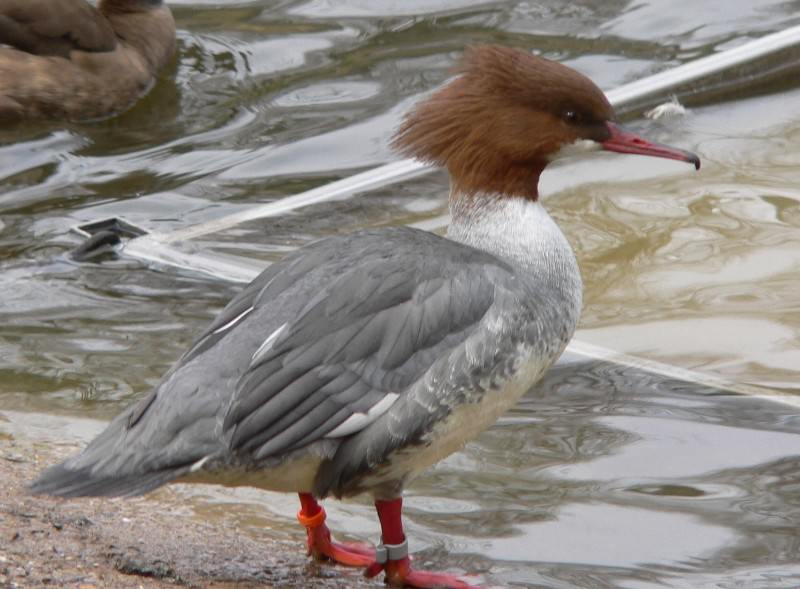 Die Schnäbel der Vögel sind orangerot, ebenso wie die Pfoten. Die Ränder des Schnabels sind mit speziellen Kerben ausgestattet, die helfen, rutschigen Fisch zu fangen und zu halten. Aus der Ferne scheinen die Merganser Schnäbel mit Zähnen zu haben. Aus diesem Grund nennen die Menschen den Vogel oft einen Bison, und aufgrund seines langen Halses und der Gewohnheit, Fisch zu essen, wird er mit einem Kormoran verwechselt.
