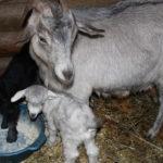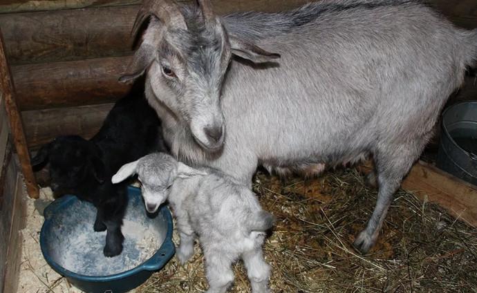 After birth, the mother is given the opportunity to lick the kids, the umbilical cord is tied, a small amount of colostrum is expressed. It should not be given to kids as it contains a high concentration of dangerous bacteria. After that, the kids can be admitted to the mother to feed the colostrum. Feeding with milk can be continued for up to 1 month, and then add fresh grass, hay and liquid cereal porridges to the feed of the kids.