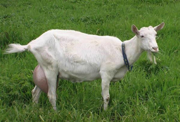 The main distinguishing features of this breed are the absence of horns, white color, large spherical udder. The body of the Saanen goat has the proportions characteristic of the dairy variety. It is trapezoidal, that is, expanding towards the back. The animal has a large belly, a barrel-shaped body, well-visible hungry pits. The back is straight, with a slight bend. Legs are thin, of medium length, with strong, cloven hooves. The tail is short, mobile, directed upwards or horizontally.
