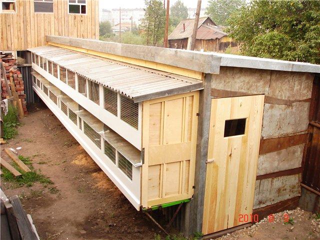Having decided on the model of the structure, they draw drawings and, on their basis, calculate the amount of materials. Shed is a structure in which you can make one common back wall. The blocks are fenced off from each other with partitions. In the front part, separate doors are installed for each section. The total length of such a structure is about 4 meters. The height of the two-tiered shed is 2 meters. The number of blocks in one row is 4 pieces. The distance to the ground is 60 cm. The height of the cage is 50 cm. These are approximate dimensions for a 8 block shed. Each breeder can come up with his own model. The main thing is that the structure must be durable, spacious and warm.