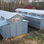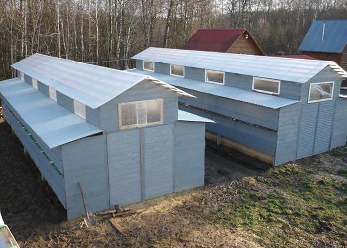 Constructions with units for keeping animals can be placed in several rows. It all depends on the number of livestock and the size of the farm. The sheds themselves are made from wooden boards or from a mesh with a fine mesh and metal pipes, slats, profiles.