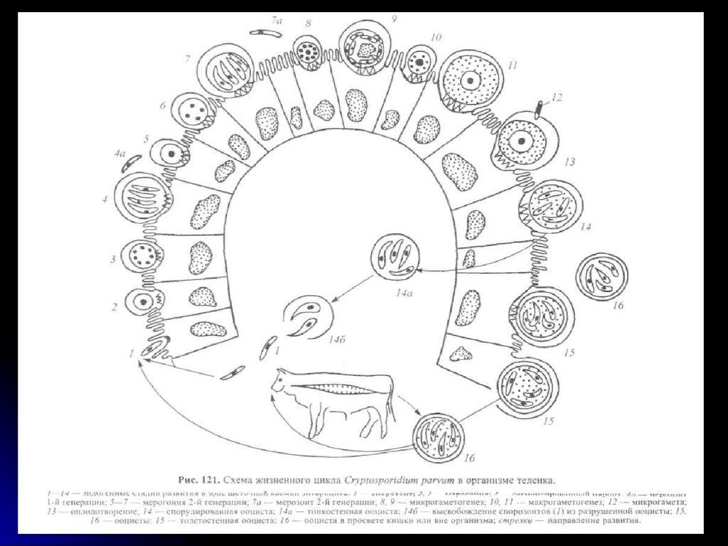 The causative agents of cryptosporidiosis are coccidia of the Cryptosporidium family - round or oval microorganisms. The parasite cell is translucent, its membrane is almost transparent. Representatives of the family are smaller than the rest of the coccidia, but almost do not respond to antimicrobial drugs. Cryptosporidia develop in the host tissues within 3-6 days, with 3 life stages going through: