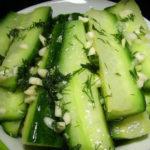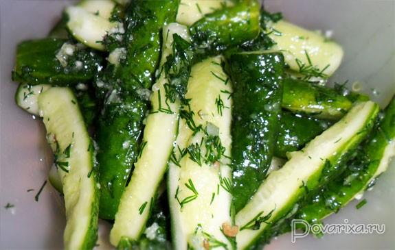 Finely chop the dill, squeeze the garlic in a crusher, grate (any option is suitable). Cucumbers in a saucepan are mixed with herbs, spices, sugar, salt, oil are added to them. The product is almost ready. It remains to mix everything, put in a cool place. After 15 minutes, lightly salted cucumbers, without sterilization, can be served. Or put in containers, close for the winter. According to a different recipe, the appetizer is prepared a little differently. For him you will need: