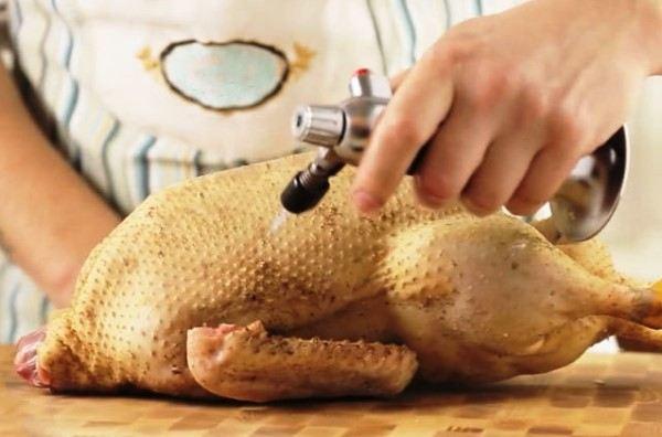 The only drawback of this method is that the meat acquires a red tint. After removing the plumage, barely noticeable hairs and fluff remain on the duck's skin. They need to be scorched with a gas burner.