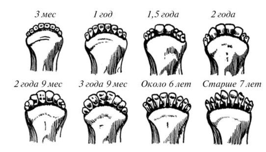 - À 4 ans, les dents de devant, situées dans la partie inférieure de la mâchoire, sont grandes, larges, sans signes de destruction ni de maladie. Les bords atteignent le même niveau que les incisives. La dentition est fermée. Littéralement après 6 mois, les dents s'usent et le dessus des incisives moyennes semble hors de la gencive