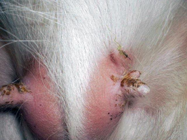 Un processus inflammatoire purulent affecte les glandes sébacées et les follicules pileux. Prédisposé à l'inflammation des chèvres à poil dense recouvrant la mamelle et à faible immunité.