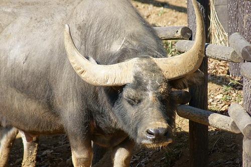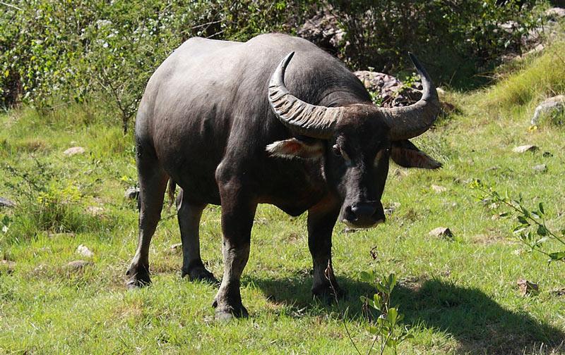 Le buffle d'Asie est un animal sauvage en voie d'extinction. Les buffles vivent en Thaïlande, au Laos, en Inde et au Bhoutan. L'énorme corps de l'animal atteint 2 m de hauteur et la masse atteint 1000 kg. La peau de buffle est de couleur noire. Dans certains endroits, les Asiatiques essaient de domestiquer. Ces personnes donnent beaucoup de viande et de lait gras.