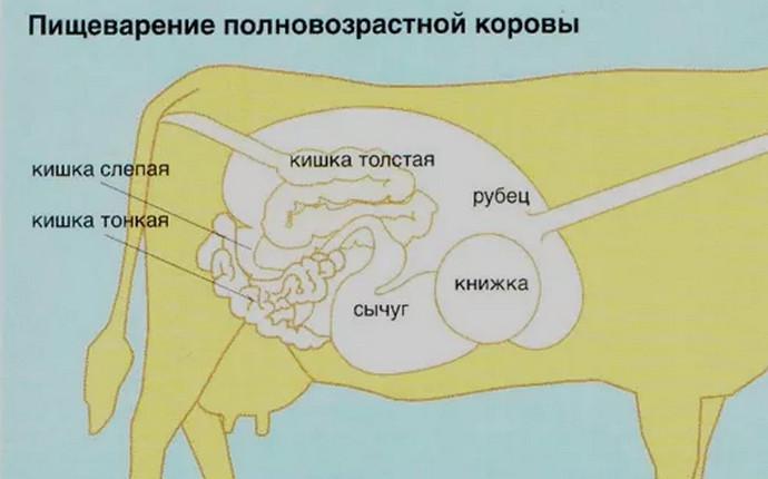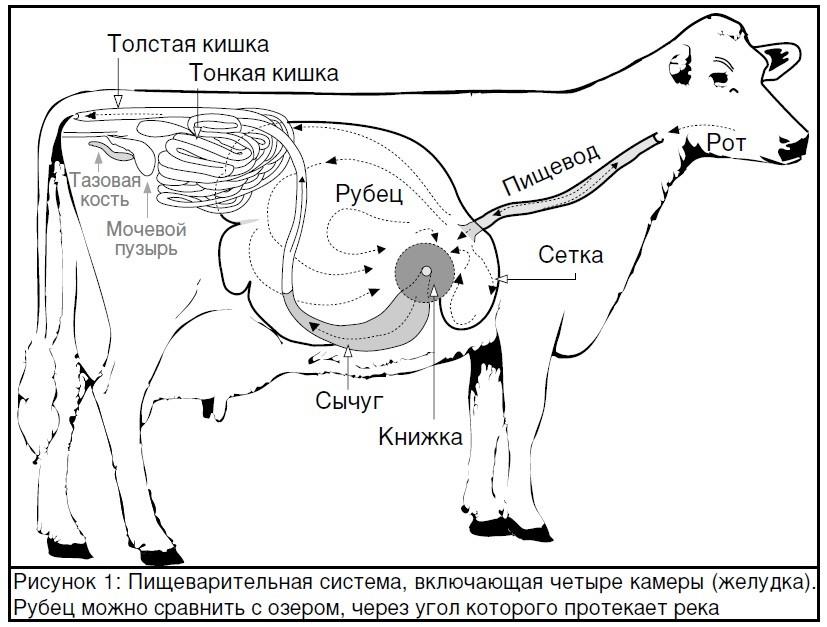 Il est complexe chez une vache, composé de quatre sections, et le suc gastrique est produit uniquement dans la caillette, qui est située à l'extrémité la plus éloignée du système à plusieurs chambres. Ce type complexe de tractus gastro-intestinal permet une digestion complète des aliments végétaux secs et grossiers.