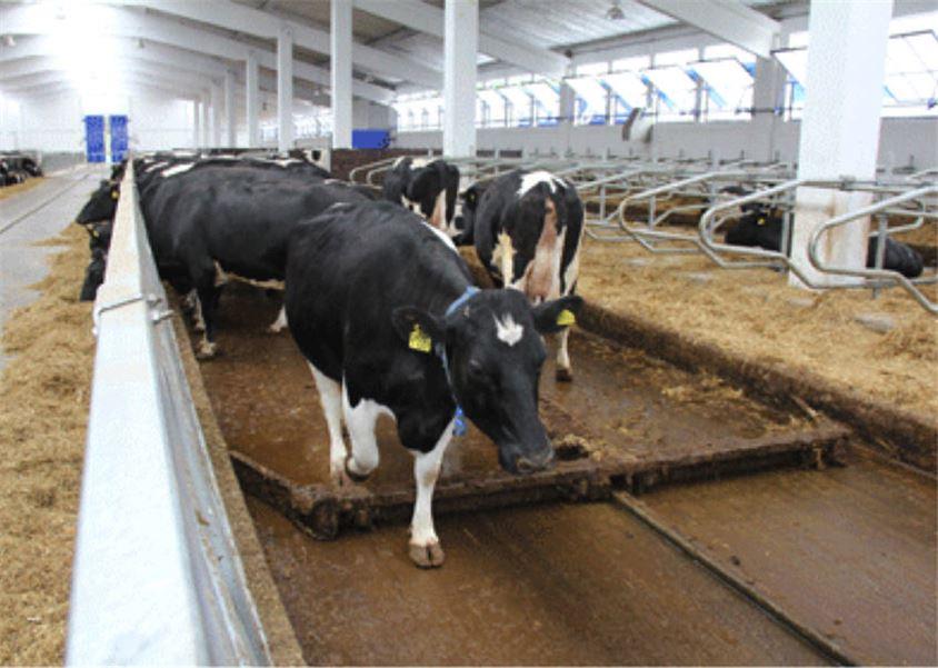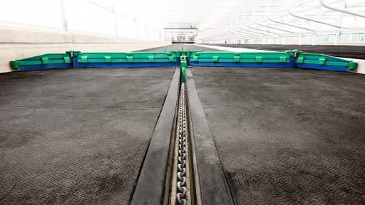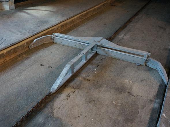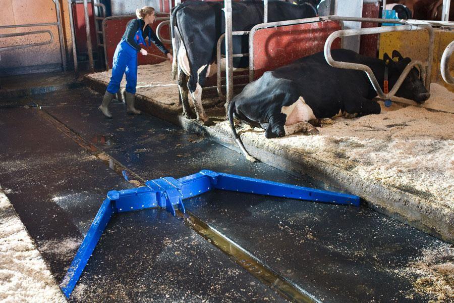 Le système collecte le fumier à l'aide de grattoirs ouverts. L'équipement fonctionne dans des passages ouverts et est sans danger pour les animaux. Le grattoir se compose de quatre parties. Le mouvement de va-et-vient du grattoir racle le fumier dans toute la zone, y compris toute la pièce et les coins difficiles à atteindre.