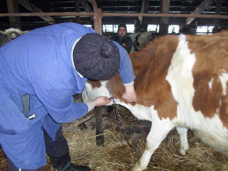 La vache doit être solidement fixée et maintenue, ce qui nécessite souvent plus d'une personne.