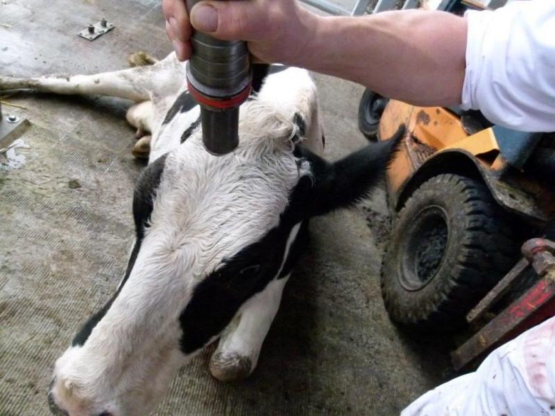 L'abatteur met un masque sur le visage de l'animal. Au lieu d'un trou dans le front, il est équipé d'une plaque métallique dans laquelle le canon d'un pistolet est inséré et la détente est tirée.