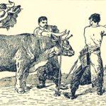 Une ancienne manière d'abattre un taureau des peuples nomades d'Europe du Nord et de Sibérie: poignarder soudainement avec un long couteau dans le cou pour percer le cœur. Avec un coup précis, l'animal meurt rapidement et le sang s'écoule par l'artère disséquée du cou.