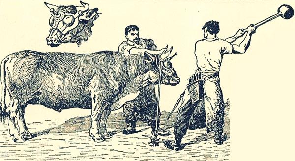 Dans l'ancien temps, les agriculteurs croyaient qu'une vache avait subi une commotion cérébrale après avoir été frappée par un marteau. Mais pour éteindre la conscience de l'animal, il faut une quinzaine de coups. En conséquence, une méthode simple au premier coup d'œil plonge le taureau dans l'agonie et la peur, et le sang ne s'écoule pas bien.