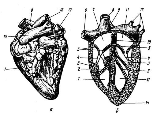Chez une vache, le cœur se compose de 4 chambres: 2 oreillettes dans la partie supérieure et 2 ventricules dans la partie inférieure de l'organe. L'intérieur est recouvert d'endocarde. Les chambres supérieure et inférieure sont unies par les lumières auriculo-ventriculaires.
