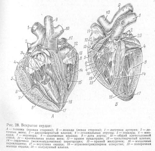 Dans le cœur bovin, les valves auriculo-ventriculaire et semi-lunaire fonctionnent, s'ouvrant et se fermant en fonction du travail contractile des ventricules et des oreillettes. La valve auriculo-ventriculaire droite est tricuspide, la gauche est bicuspide.L'anatomie de la lumière auriculo-ventriculaire est telle qu'au stade du fonctionnement auriculaire, les valves sont pressées contre le ventricule par le sang. Et lorsque les ventricules commencent à fonctionner, la pression artérielle augmente les valves, les forçant à fermer les lumières. Des poches semi-lunaires ferment la base des artères.