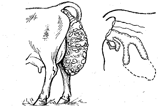 Il est difficile de ne pas remarquer que l'utérus est tombé, c'est difficile - l'organe est grand, en forme de poire, avec un prolapsus complet, il peut pendre de la vache aux articulations du jarret. Au début, il a une couleur rouge vif, quand il est à l'extérieur du corps pendant plusieurs heures, il devient brun, acquiert parfois une couleur bleuâtre. Des traces du placenta peuvent être visibles à la surface de l'utérus, car il est tourné vers l'extérieur. Parfois, il arrive que la vessie et une partie du rectum prolapsus avec l'utérus, mais de tels cas sont généralement rares.