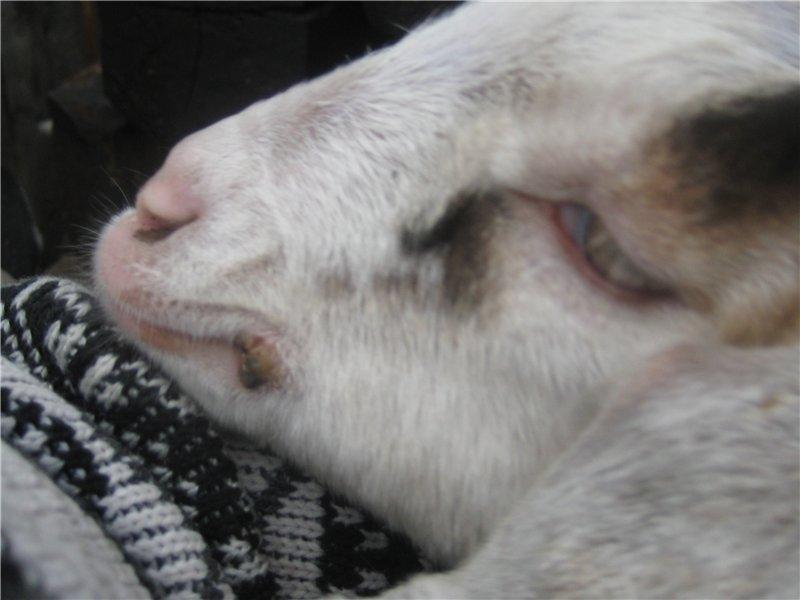 Tout d'abord, des taches rouges apparaissent dans les coins de la bouche et le long des bords des lèvres, à l'intérieur desquelles se forment des nodules, se transformant en pustules et vésicules. Après un certain temps, ils s'ouvrent, l'intégrité de la membrane muqueuse est violée. À la place des abcès, des croûtes et une croûte sèche de couleur brun foncé se forment. Les agneaux infectés ont de la fièvre et ont du mal à manger et à boire de l'eau. En raison de l'épuisement, près de 90% des jeunes meurent.