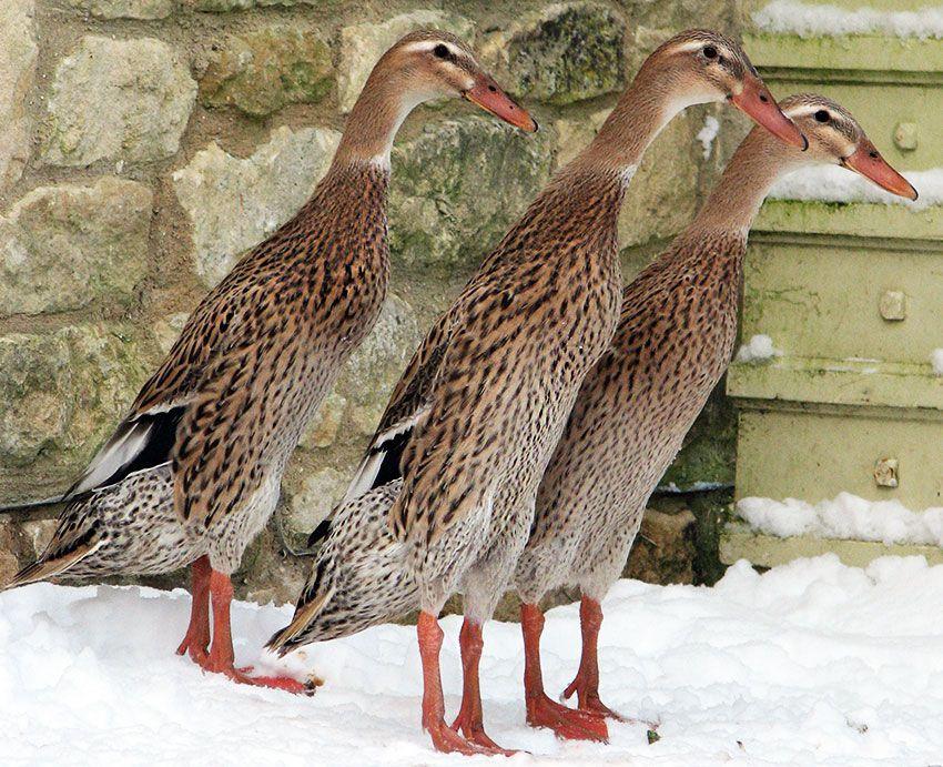 La coloration dépend de la lignée parente. Aujourd'hui, les coureurs sont considérés comme les canards les plus pondeurs. Le coureur ne peut pas être confondu avec d'autres espèces en raison de son corps allongé spécial et de sa petite taille. Les coureuses montrent une capacité unique à prendre soin de leur progéniture pendant longtemps.
