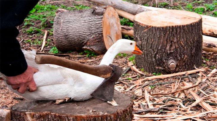 - Décapitez la carcasse. Prenez l'oiseau par la tête, étirez son cou, coupez l'artère carotide avec un couteau. Dans ce cas, la lame du couteau doit être légèrement inclinée vers le bas. Une autre façon est de prendre le canard par les ailes, de poser sa tête sur le pont, de le couper avec une hache.