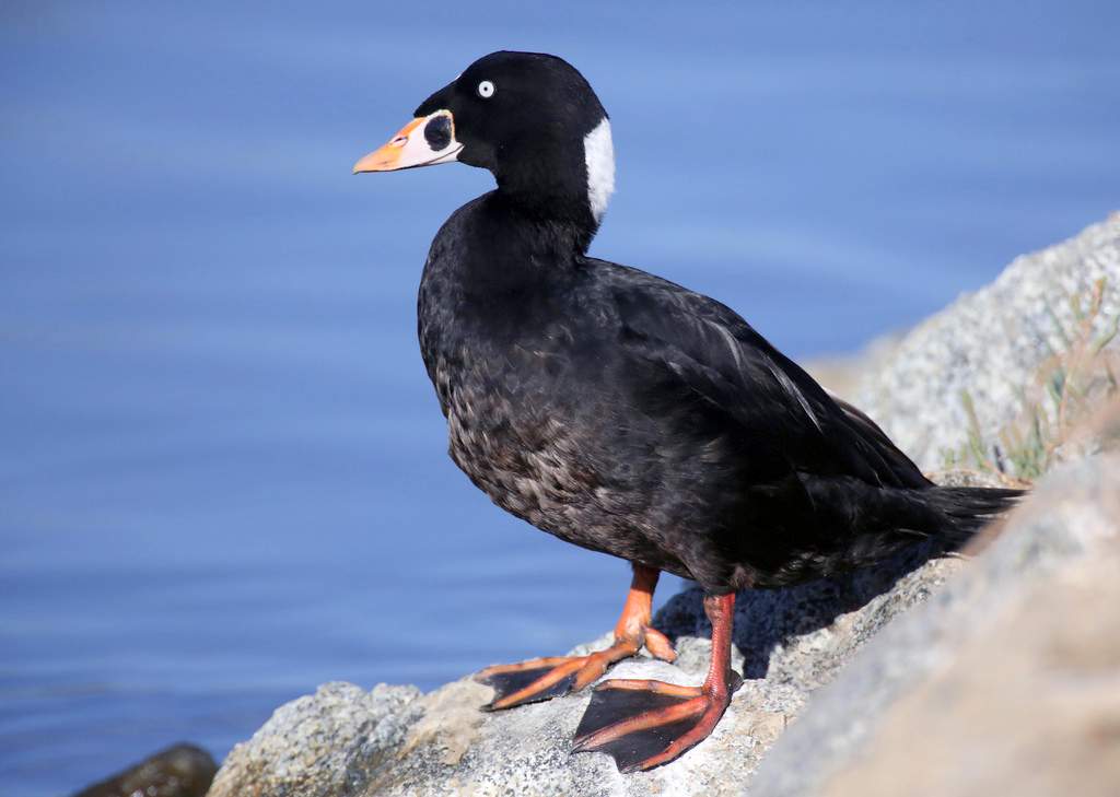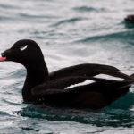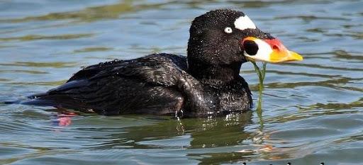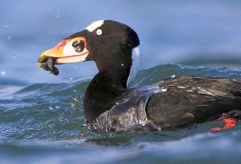 - Scooter repéré. Un petit canard pesant environ 1 kg. La particularité de l'apparence est la couleur du bec: taches blanches et motifs rouges sur une base noire. La voix des oiseaux est un charlatan silencieux avec un sifflet. Habitat - lacs au Canada, nord des États-Unis, forêts de conifères de l'Alaska.