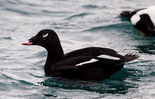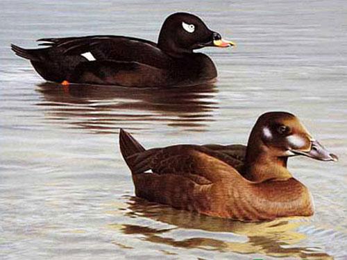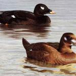- Scooter bosse. Chez les mâles, le plumage noir est irisé, les nuances bleu-violet et vert sont perceptibles. Les taches blanches sous les yeux sont plus grandes, couvrent l'arrière de la tête. Le nom est dû à des narines plus larges et à une bosse convexe. La zone d'origine est celle des lacs de la taïga.